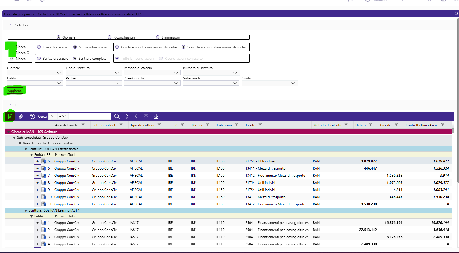 Una volta visualizzate le scritture si possono esportare in excel con il pulsante dedicato evidenziato sotto.