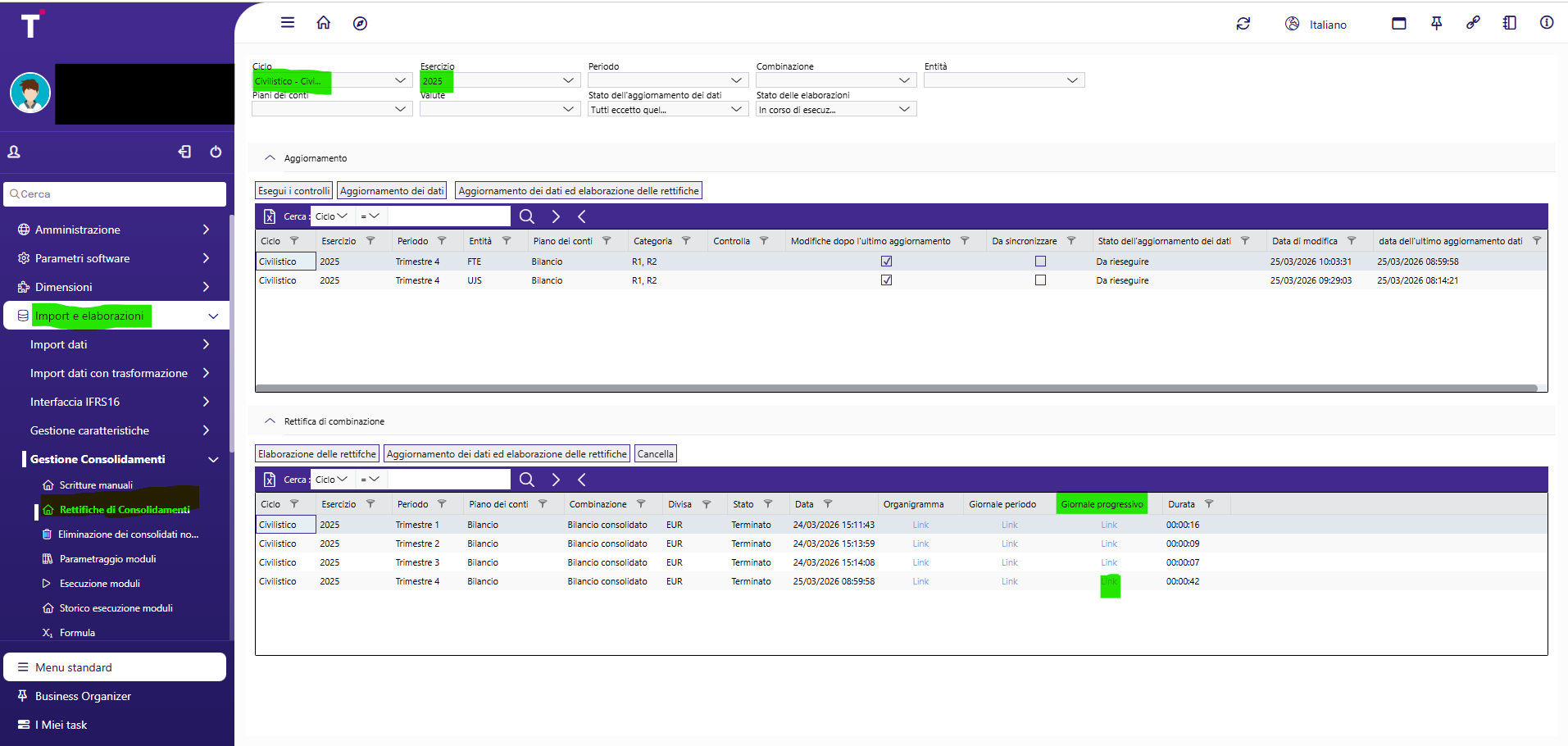 Per estrarre il libro giornale con i dati delle scritture in progressivo, accedere al menu delle rettifiche di consolidamento, richiamare il consolidato per cui si necessita l'estrazione del libro giornale, e cliccare su LINK (evidenziato sotto)